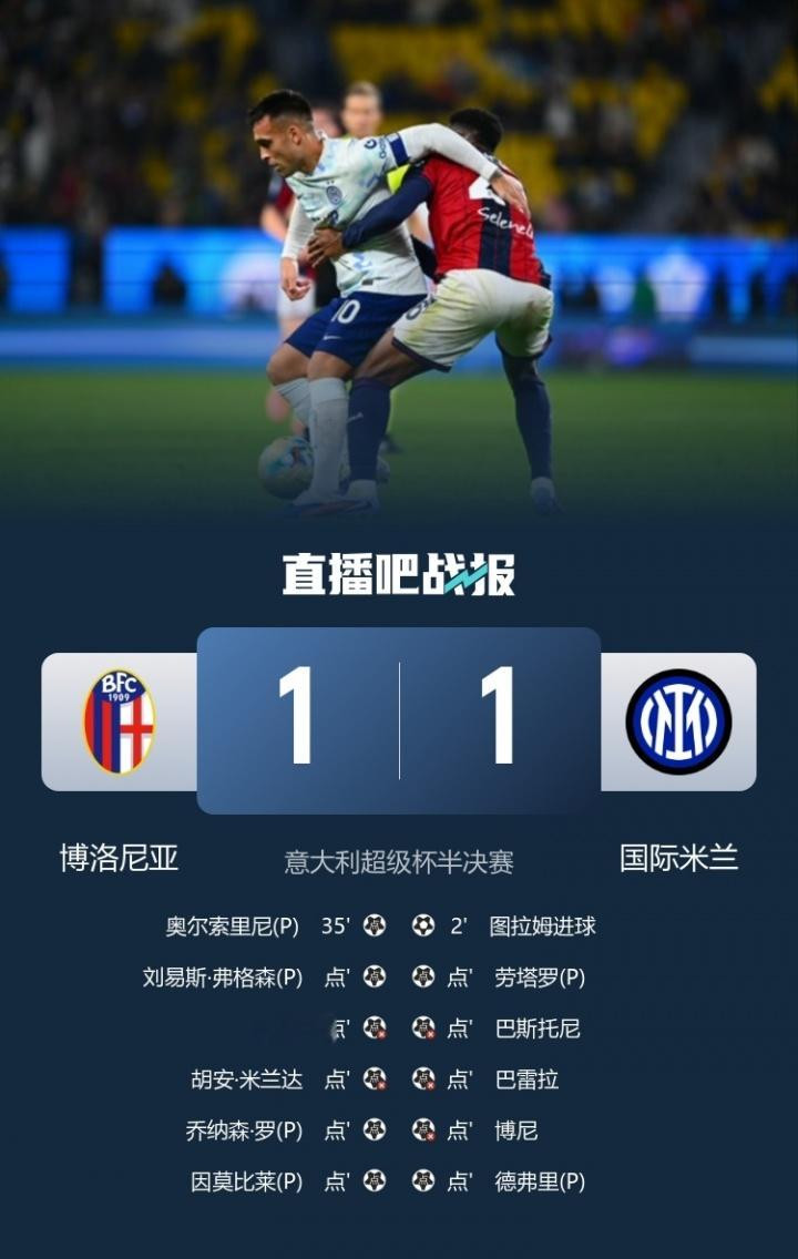 直播吧12月20日讯意超杯半决赛第2场,博洛尼亚在点球大战中驯顺国米,队史首进意超杯决赛,将对阵那不勒斯。