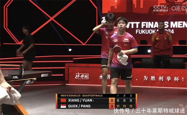 WTT福冈总决赛男双1/4决赛,向鹏/袁励岑0-3不敌新加坡组合冯耀恩/郭勇,停步8强体育赛事直播,三局比分为6-11、6-11、9-11。因为总决赛双打是8对搭档,是以国乒组合遭受了一轮游。