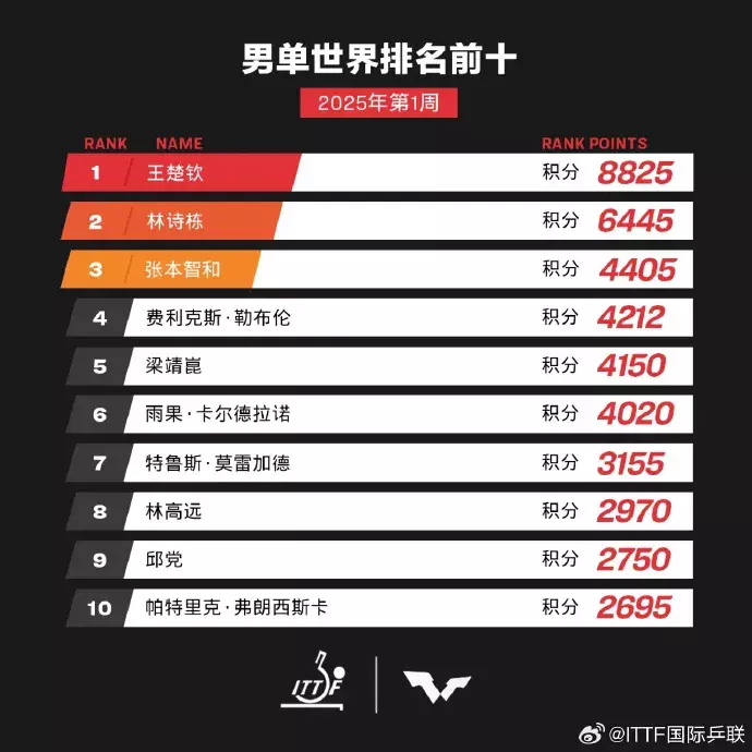 男人单打,中国队球员王楚钦、林诗栋位列前二,梁靖崑位列第五,林高远位列第八。
